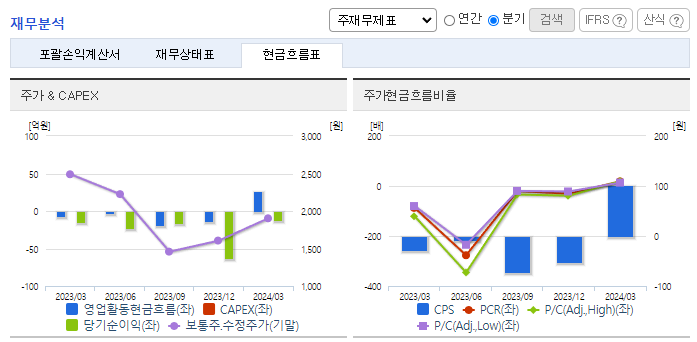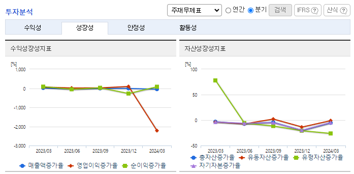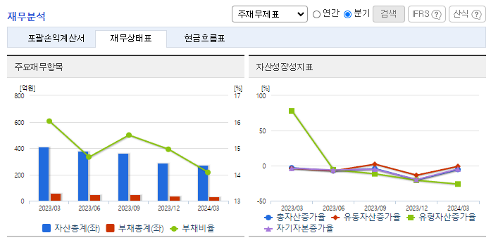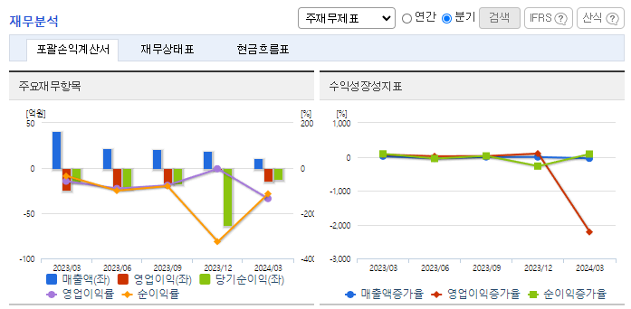 -2024년 3월 전년동기 대비 연결기준 매출액은 74.7% 감소, 영업손실은 41.1% 감소, 당기순손실은 18.3% 감소. 게임 매출의 악화에 따라 매출액이 크게 감소하였고, 이에 종업원의 급여 및 광고 선전비 등 다양한 부문에서의 비용을 축소하고 있음. 2024년 4월 제3자 배정 유상증자를 통해 최대주주를 변경하였음. 이에 따라 대주주자 변경되면서 대표이사 또한 변경됨.