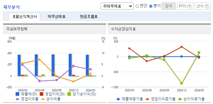 -2024년 3월 전년동기 대비 연결기준 매출액은 0% 증가, 영업이익은 42.8% 감소, 당기순이익은 83.8% 감소. 인구고령화 추이 및 만성질환 증가로 인하여 고령화 및 QoL 타겟 품목의 매출이 증가하고 있음. 그러나 비용 증가로 수익성은 낮아지고 있음. 동사는 신약 파이프라인에 대해 생산권과 IP지분을 확보하여 가동률을 향상함과 동시에 안정적인 수익을 창출할 수 있는 "생산플랫폼 기반 R&D" 사업모델을 추진하고 있음.