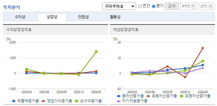 -2024년 1분기 연결기준 매출액은 전년동기 대비 27.6% 증가, 영업이익은 66.8% 증가, 당기순이익은 4% 감소. 에스디생명공학 영업손실 20억 원이 반영되었음에도 불구하고 ETC제품 고마진 품목에서의 고성장세에 따른 매출원가율 하락으로 전년대비 66.8% 증가함. 2023년 12월 화장품 판매를 주요 사업으로 영위하는 에스디생명공학을 400억에 인수하여 종속회사로 편입시킴.