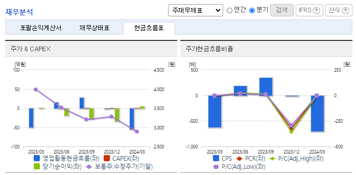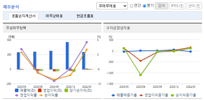 -2024년 3월 전년동기 대비 연결기준 매출액은 2% 증가, 영업이익은 140.7% 증가, 당기순이익은 294.4% 증가. 외형 성장이 정체된 가운데 비용 통제로 영업손익과 순손익은 흑자구조를 유지함. 감사범위제한으로 인한 의견거절로 상장폐지 사유가 발생했으나 이의 신청서 접수로 차기 사업보고서 법정제출기한의 다음날부터 10일('25.04.10)까지 개선기간을 부여하였으며, 동 개선기간 중에는 매매거래정지 지속.