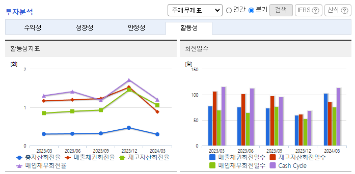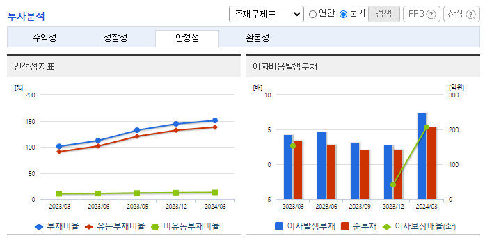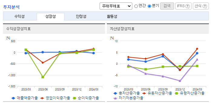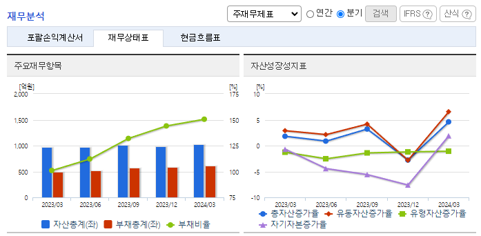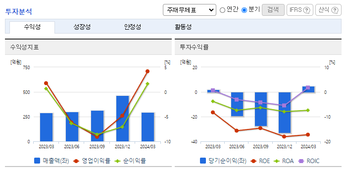 -2024년 3월 전년동기 대비 연결기준 매출액은 2% 증가, 영업이익은 140.7% 증가, 당기순이익은 294.4% 증가. 외형 성장이 정체된 가운데 비용 통제로 영업손익과 순손익은 흑자구조를 유지함. 감사범위제한으로 인한 의견거절로 상장폐지 사유가 발생했으나 이의 신청서 접수로 차기 사업보고서 법정제출기한의 다음날부터 10일('25.04.10)까지 개선기간을 부여하였으며, 동 개선기간 중에는 매매거래정지 지속.