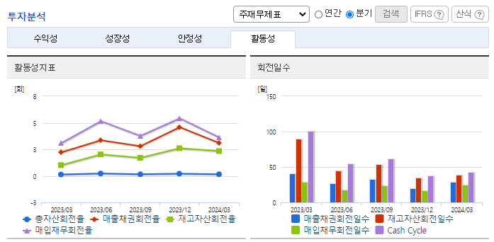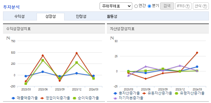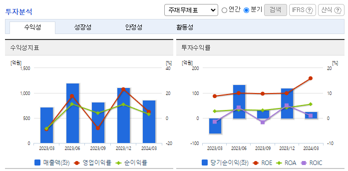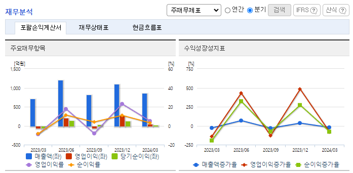 -2024년 3월 전년동기 대비 연결기준 매출액은 20% 증가, 영업이익 흑자전환, 당기순이익 흑자전환. 고객사의 선박수요가 회복됨에 따라 동사의 매출도 전년동기 대비 소폭 상승하는 모습을 보임. 원가율 개선에 힘입어 영업이익은 큰 폭으로 증가함. 가동률 향상을 위해 작업 환경 개선에 힘쓰고 있으며 암모니아 운반선 시장의 성장이 예상되며 신조 발주에 긍정적인 환경이 조성되어 큰 폭의 외형 성장을 도모하고 있음.