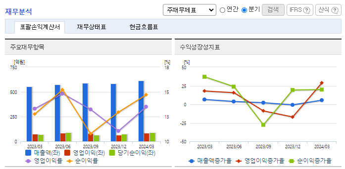 -2024년 3월 전년동기 대비 연결기준 매출액은 10.9% 증가, 영업이익은 12.6% 증가, 당기순이익은 27.4% 증가. 정신신경용제, 해열 소염 진통제, 순환계용약, 소화성궤양용제의 매출이 전년동기 대비 증가하면서 전체적인 매출증가를 이끌어내고 의사를 대상으로 한 디테일 영업의 강화 및 비용절감, 매출채권의 효율화에 노력. 우수 의약품 생산 등을 통한 타사와의 경쟁력 제고 및 업체들 간의 경쟁 강화로 실적 향상에 힘씀.