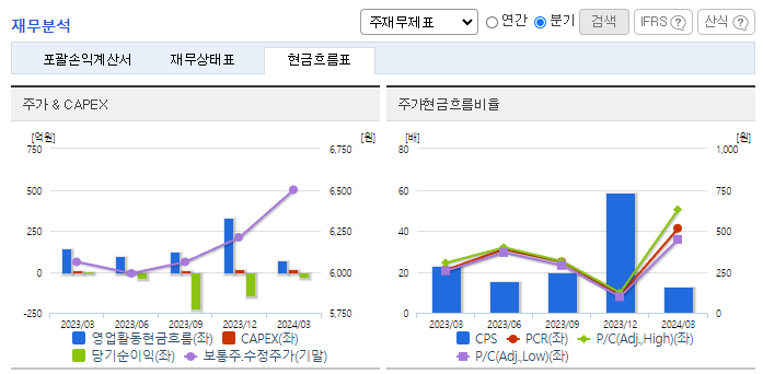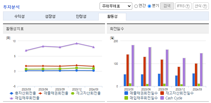 -2024년 3월 전년동기 대비 연결기준 매출액은 6.3% 감소, 영업이익 적자전환, 당기순이익 적자전환. 중국산 저가 제품의 영향 등으로 전체 매출에서 30%를 차지하는 중국 사업이 어려움을 겪으며 실적 부진을 겪고 있고, 매출 저하로 영업이익이 327% 감소하며 적자전환하였음. 동사는 희망퇴직을 받아 국내 사업장의 인력을 감축하는 한편 중국법인들의 청산과 매각도 진행하며 구조조정에 박차를 하고 있음.