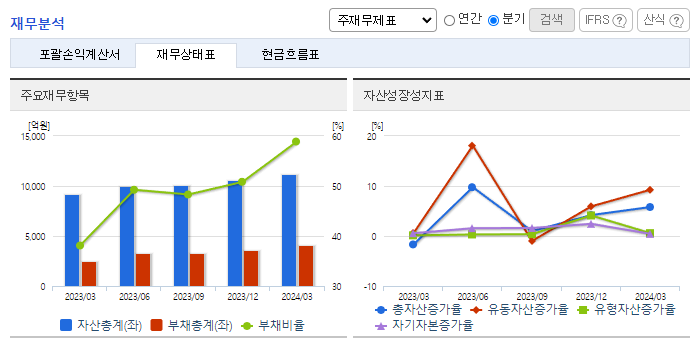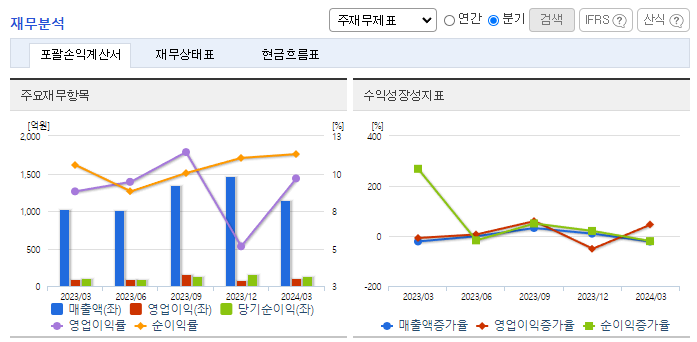 -2024년 3월 전년동기 대비 연결기준 매출액은 10.9% 증가, 영업이익은 21.8% 증가, 당기순이익은 18.5% 증가. 내수판매는 소비심리 위축과 전기차 판매 부진, 수입차 판매 부진 등으로 감소하였으며 수출은 북미시장 수출호조와 친환경차 인기지속, 전년동기 높은 실적에 대한 역기저효과로 증가하였음. 해외시장 개척, 신제품 개발 등에 따른 양산 설비 및 공장시설을 유지하기 위한 수선, 성능 개선에 150억 원을 투자할 예정.
