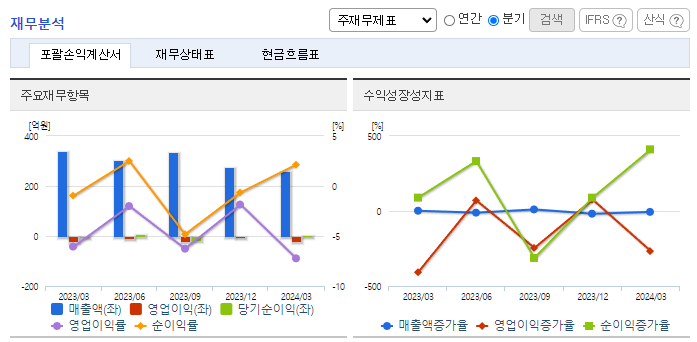 -2024년 3월 전년동기 대비 연결기준 매출액은 21.1% 감소, 영업손실은 70.6% 증가, 당기순이익 흑자전환. 원자재가격 상승과 수급 불안 및 전력료, 스팀료 등 에너지 가격 상승으로 인하여 매출원가율이 증가함에 따라 영업손실이 증가함. 환율 급등에 따라 보유한 달러채권 및 달러예금 등의 미달러 금융자산 평가이익 증가 등으로 인하여 당기순이익은 흑자전환함.