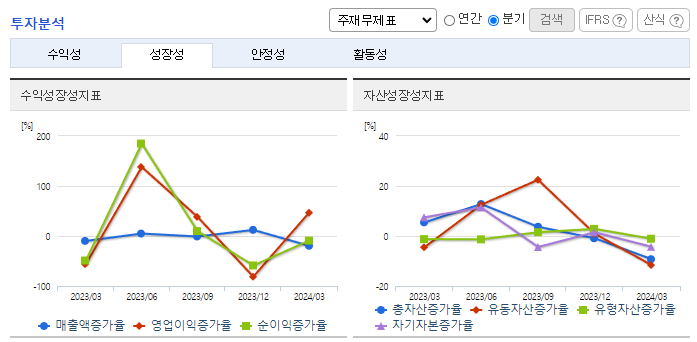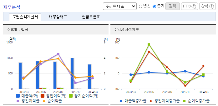 -2024년 3월 전년동기 대비 별도기준 매출액은 6.2% 감소, 영업이익은 10.1% 감소, 당기순이익은 16.7% 증가. 완성차 업체의 전기차 라인업 확대, 신규 하이브리드 모델 보강 등으로 인해 친환경차 시장의 성장은 지속될 것으로 예상됨. 완성차 수출액은 전년동기 대비 2.7% 증가하였으며 주요 해외 시장의 수요 확대에 따른 지속적인 판매 성장세와 원화 약세에 따른 우호적 환율 효과로 인해 수익성이 확대된 것이 주된 요인임.