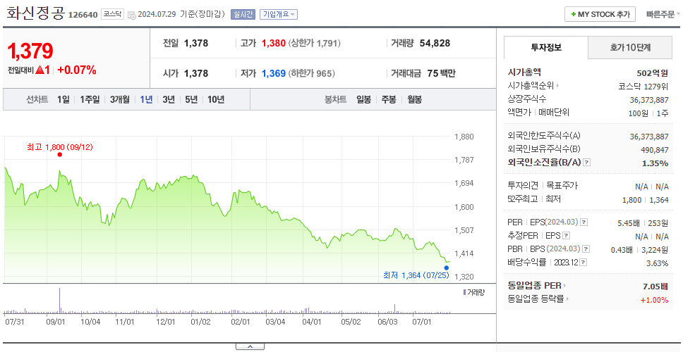 화신정공은 자동차부품 기업으로 장중 기준으로 주가는 1,378원입니다. 화신정공의 시가 총액은 502억 원이며 발행 주식수는 36,373,887주입니다. 외국인 보유 비중은 1.35%이며 장중 거래량은 54,828를 기록했습니다. 24년 1분기 매출액은 794억 원, 영업이익은 11억 원을 달성했으며, EPS는 35원입니다. 화신정공 주식 배당수익률은 3.63%입니다.