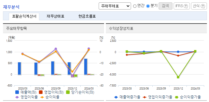 -2024년 3월 전년동기 대비 연결기준 매출액은 28.2% 증가, 영업이익 흑자전환, 당기순이익 흑자전환. 대규모 신규 수주를 기반으로 한 매출 증가로 호실적을 기록함. 국내 대기업향 소방설비 신규 수주가 매출에 반영되었고, 매출원가율 개선 및 판관비 절감을 통해 영업이익이 개선되었음. 12월부터 5인승 이상 승용차 대상 차량용 소화기 설치가 의무화되는 가운데 신제품 개발 및 사업 확대를 통해 지속적으로 흑자를 이어나갈 예정임.