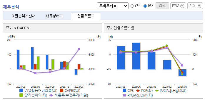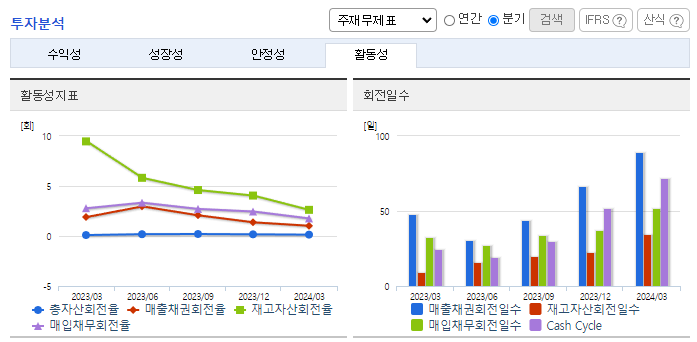 -2024년 3월 전년동기 대비 연결기준 매출액은 138.7% 증가, 영업이익 적자전환, 당기순이익은 77.9% 감소. 국내의 경우 각종 세제류를 공급하는 생활건강사업부의 매출이 꾸준히 증가하여 전년 동기대비 약 2배의 분기 매출을 달성함. FPBA가 적용되는 모바일폰은 매 해 새로운 모델을 정기적으로 출시하고 있지만 출시된 모바일폰의 FPBA 주문 및 공급량이 다소 저조함을 보여 영업이익의 감소에 영향을 줌.