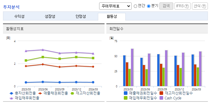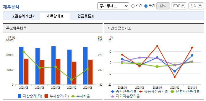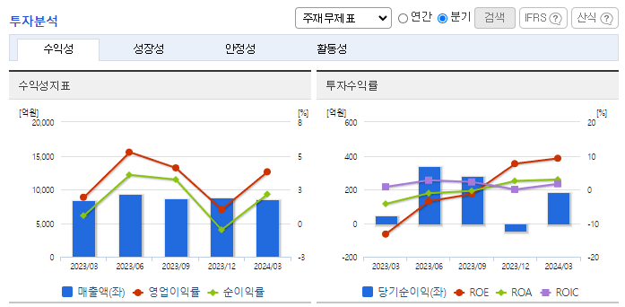 -2024년 3월 전년동기 대비 연결기준 매출액은 1.1% 증가, 영업이익은 101.1% 증가, 당기순이익은 292.7% 증가. 통상적인 건자재 비수기에도 원자재 가격이 안정화되어 1분기 수익성이 크게 개선되었음. 실적의 가장 큰 요인은 자동차소재 및 산업용 필름 부문이 4.9% 영업이익률을 기록했기 때문임. 북미 중심의 자동차 원단 판매가 커진 데다 해외 거래처 다변화에 따른 산업용 필름 적용 모델이 확대되면서 마진이 개선됨.