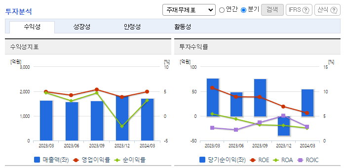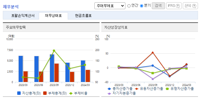 -2024년 1분기 연결기준 매출액은 전년동기 대비 5.6% 증가, 영업이익은 13.7% 감소, 당기순이익은 37.1% 감소. 반도체 유통 부문의 매출은 소폭 반등하였으나, 원가율 상승으로 영업이익은 줄어듦. 부동산 개발 종속회사는 적자를 기록함. 이자비용 증가와 관계기업에 대한 지분법손실로 당기순이익은 큰 폭으로 줄어듦. 투자부문을 인적분할을 통해 주력인 비메모리 반도체 솔루션 사업에 집중할 계획임.