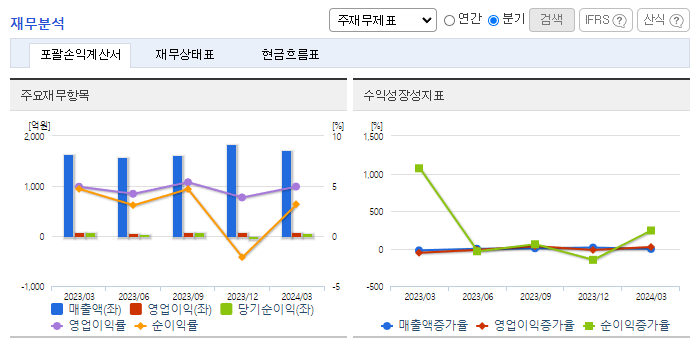 -2024년 1분기 연결기준 매출액은 전년동기 대비 5.6% 증가, 영업이익은 13.7% 감소, 당기순이익은 37.1% 감소. 반도체 유통 부문의 매출은 소폭 반등하였으나, 원가율 상승으로 영업이익은 줄어듦. 부동산 개발 종속회사는 적자를 기록함. 이자비용 증가와 관계기업에 대한 지분법손실로 당기순이익은 큰 폭으로 줄어듦. 투자부문을 인적분할을 통해 주력인 비메모리 반도체 솔루션 사업에 집중할 계획임.