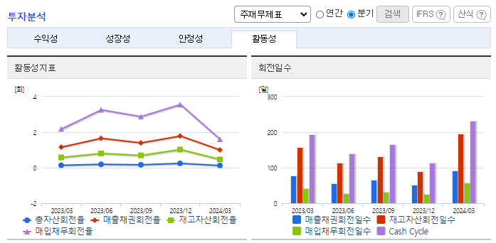 -2024년 3월 전년동기 대비 연결기준 매출액은 1.3% 감소, 영업이익 흑자전환, 당기순이익 흑자전환. 신조선 수요가 증가하고 선별 수주, 부품서비스 사업 수익성 개선 등 질적 성장을 도모하며 민수사업부문 매출이 전년동기 대비 증가하였고 이에 힘입어 영업이익 흑자전환에 성공함. 중동시장 진출 가능성이 커지며 2024년 1월 이집트에 수출하는 한화에어로스페이스 K9 자주포 엔진 납품 공급계약을 맺는 등 관련 수요 증가가 기대됨.