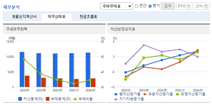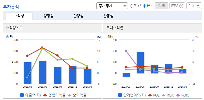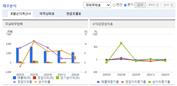 -2024년 3월 전년동기 대비 연결기준 매출액은 29.2% 감소, 영업이익은 80.3% 감소, 당기순이익 흑자전환. 중국과 일본산 철강 유입, 철근 수요 감소 등으로 국내 철근 시장 경쟁이 심화되며 동사의 매출과 영업이익이 모두 전년동기 대비 감소함. 미래 이익 창출을 위한 중장기 신규 사업은 지속적으로 연구 개발할 예정이며, 철근으로 진행되는 연계사업 중 철근가공을 비롯하여 커플러, 선조립 등의 수직계열 확대를 꾀하고 있음.