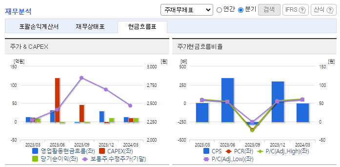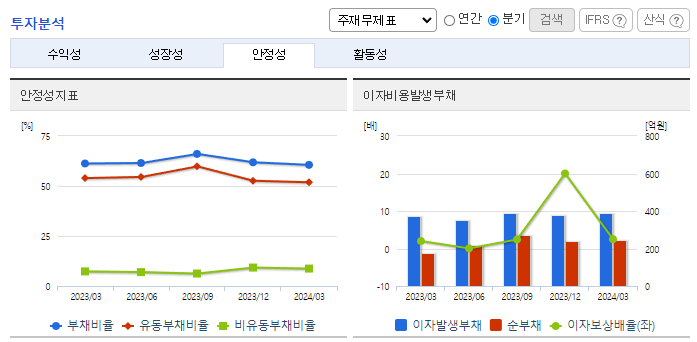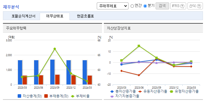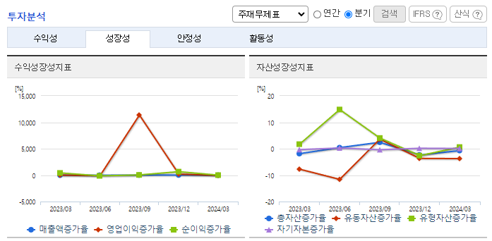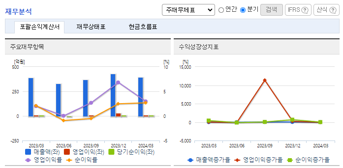 -2024년 3월 전년동기 대비 연결기준 매출액은 0.2% 증가, 영업이익은 48.9% 증가, 당기순이익은 33.9% 증가. 위더스케미칼(주)을 통해 영위하는 포장용 및 라벨용 수축필름 사업의 부진으로 외형 성장이 정체되었으나 원가율 개선으로 영업손익과 순손익 모두 개선됨. 자회사를 통해 수행하는 모바일 관련 부품의 경우 구매대행에서 원자재 직접 구매로 변경하여 안정적인 원료 확보 및 수익성 확보 등의 성장 전략을 보유하고 있음.