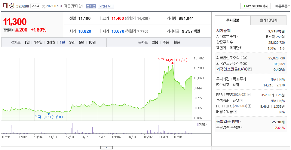 태성은 전자 장비 및 기기 기업으로 장중 기준으로 주가는 11,100원입니다. 태성의 시가 총액은 2918억 원이며 발행 주식수는 25,820,730주입니다. 외국인 보유 비중은 0.42%이며 장중 거래량은 881,041를 기록했습니다. 24년 1분기 매출액은 177억 원, 영업이익은 21억 원을 달성했으며, EPS는 91원입니다. 태성 주식 배당수익률은 없습니다.