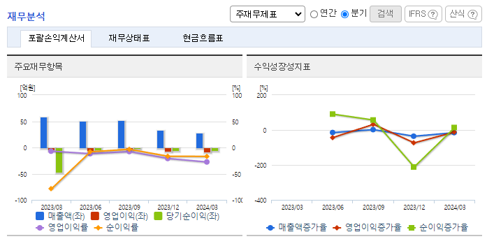 -2024년 3월 전년동기 대비 별도기준 매출액은 52.2% 감소, 영업손실은 87.5% 증가, 당기순손실은 89.7% 감소. 주요 매출 품목인 광증폭기, 광송수신기의 수출폭이 크게 감소하였음. 주요 해외 매출지역인 유럽에서의 매출이 70%가량 감소하였으며, 일본 지역에서 또한 매출이 감소함. 정부의 모빌리티 혁신 기술 및 서비스 상용화 소식과 더불어 기업공개를 통해 인지도 및 자금조달능력을 확대하고 해외개척을 통해 성장하고자 함.