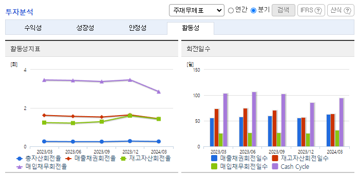 -2024년 3월 전년동기 대비 연결기준 매출액은 4.8% 감소, 영업이익은 336.5% 증가, 당기순이익 흑자전환. 판매비와 관리비가 9.8% 증가했음에도 원재료 가격 하락과 함께 매출원가가 12.5% 감소하면서 영업이익에 긍정적인 영향을 줌. 매트리스폼 개발, 전동벨트 개발, 점증제, 우레탄, 고무복합재 등 제지 외 분야 신규테마 발굴/개발로 신성장동력 확보함.
