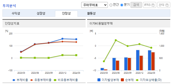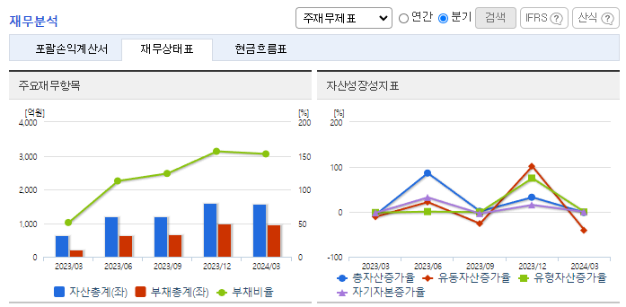 -2024년 3월 전년동기 대비 별도기준 매출액은 27.3% 감소, 영업손실은 143% 증가, 당기순손실은 225.8% 증가. 매출은 증가했으나, 주요 원재료의 가격상승으로 인해 원가부담이 확대되었고, 판관비도 높은 수준임. 건설사 수주 이연으로 실적 감소. 건설경기에 민감한 업종으로 해당 분야에서 반등이 일어나야 함. 원재료 등 비용절감으로 다방면에서 노력하나 매출감소로 영업적자 확대.