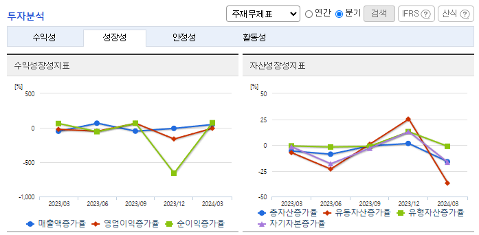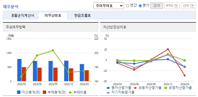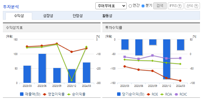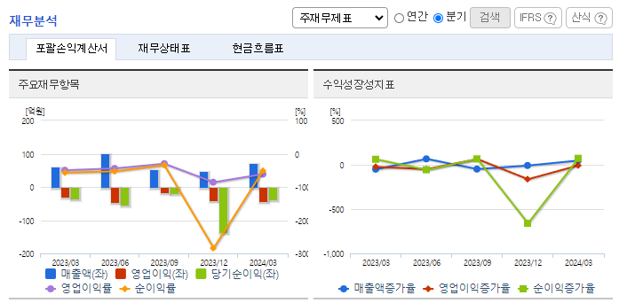 -2024년 3월 전년동기 대비 연결기준 매출액은 17.5% 증가, 영업손실은 45.8% 증가, 당기순손실은 13.4% 증가. 필름소재 사업 부문은 11.66% 감소했지만, 디스플레이 사업 부문이 70.83% 증가하면서 전체 외형 성장을 이끎. 현재는 LCD에서 OLED로 생산설비가 이전되는 과도기적 상황으로 향후 OLED 양산라인의 투자가 본격화될 경우 동사가 1차적인 수혜를 입을 것으로 기대하고 있음.