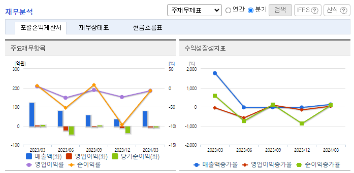 -2024년 3월 전년동기 대비 연결기준 매출액은 2.5% 감소, 영업이익 적자전환, 당기순이익 적자전환. 동사는 보안사업부문이 매각되고 당분기 상품판매 부문의 매출액이 존재하지 않아 매출액이 전년동기 대비 감소하였음. 모바일 시장의 특성상 이와 같은 모바일 게임서비스는 대부분 글로벌 마켓사인 구글, 애플 등을 통해 제공/결제되며 동사도 구글 및 애플 등을 통해 발생하는 매출액 비중이 높음.