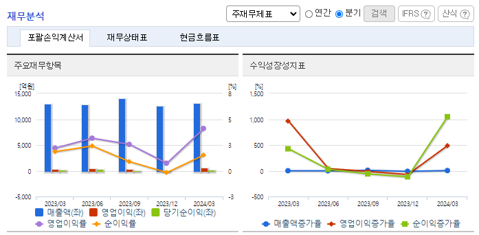-2024년 3월 전년동기 대비 연결기준 매출액은 1.1% 증가, 영업이익은 88.8% 증가, 당기순이익은 52.5% 감소. 해외 가공식품 시장은 전 세계적으로 K-Food에 대한 관심이 높아지면서, 다양한 한국 식품들의 출시가 증가로 인한 수익구조 개선됨. 해외 법인은 꾸준히 현지 식품 업체와 협업하면서 한국 음식의 세계화는 물론 B2B, B2C 품목의 포트폴리오 및 영업망을 확대 중임.