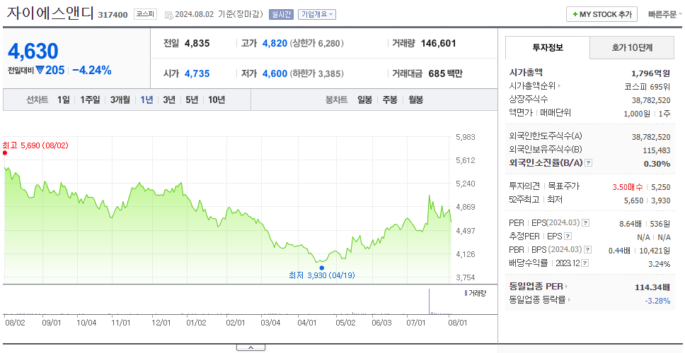 자이에스앤디는 건설 기업으로 장중 기준으로 주가는 4,630원입니다. 자이에스앤디의 시가 총액은 1796억 원이며 발행 주식수는 38,782,520주입니다. 외국인 보유 비중은 0.30%이며 장중 거래량은 146,601를 기록했습니다. 24년 1분기 매출액은 4,005억 원, 영업이익은 6억 원을 달성했으며, EPS는 12원입니다. 자이에스앤디 주식 배당수익률은 3.24%입니다.