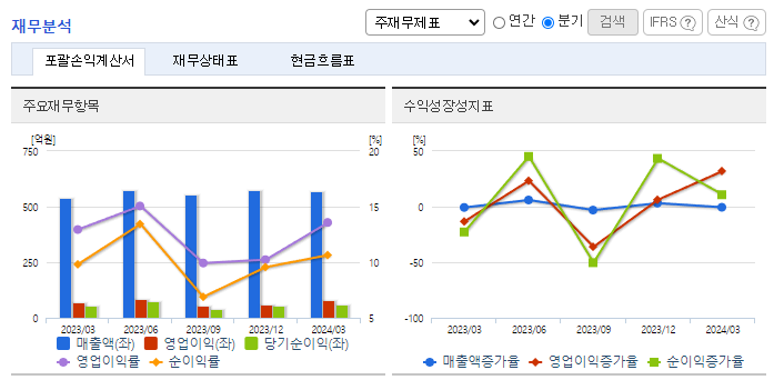 -2024년 3월 전년동기 대비 별도기준 매출액은 5.5% 증가, 영업이익은 10.7% 증가, 당기순이익은 14.4% 증가. 우크라이나와 러시아 전쟁의 장기화 및 중동 분쟁 가시화로 인해 유가 및 달러 인상되었고, 그로 인해 원부자재 일부 품목이 단가가 인상되었음. 동사는 2022년부터 2023년까지 총 24개의 신제품을 발매하였으며, 24년 2분기 중 4개의 신제품 추가발매와 24년 중 개량신약 1개의 추가발매를 목표로 순항 중임.