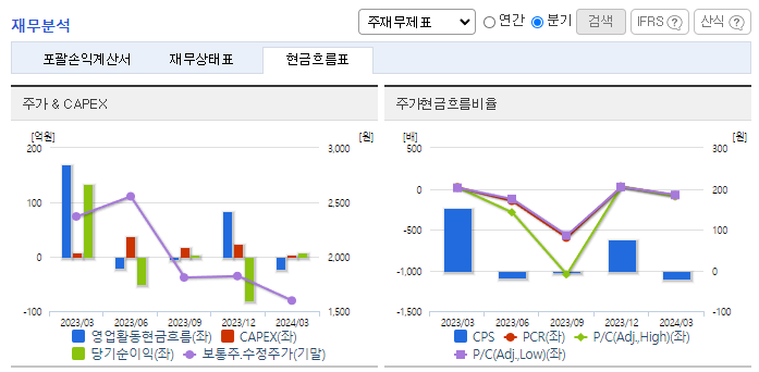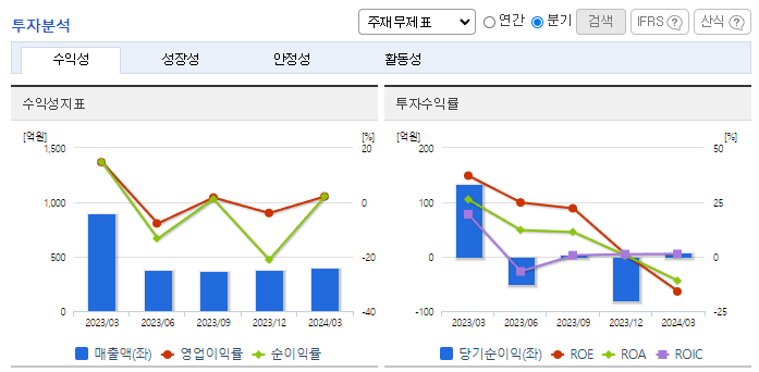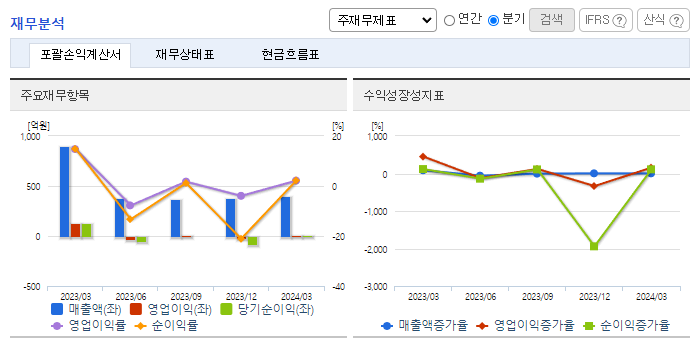 -2024년 3월 전년동기 대비 연결기준 매출액은 55.7% 감소, 영업이익은 93.5% 감소, 당기순이익은 93.4% 감소. 가성비, 가심비, 한정판, 오픈런 등으로 소비패턴이 바뀌며 중국산 저가전지 유입이 많이 증가 및 업체 간 경쟁 심화로 동사의 배터리 매출액이 전년동기대비 약 76 % 감소함. 경상북도 구미공장의 생산설비 최적화, 자체 정비 기술력을 기반으로 안정적인 유통 공급과 제품 원가 개선을실함.