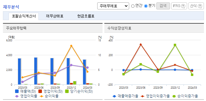 -2024년 3월 전년동기 대비 연결기준 매출액은 4.2% 감소, 영업이익은 520.2% 증가, 당기순이익은 72.3% 증가. 미국 러시아 등 주요 소맥 수출국의 작황 호조 및 러시아-우크라이나 전쟁 여파 완화로 인해 전년대비 원재료비가 하락하여 영업이익 개선에 영향을 줌. 지속적인 생산 효율 및 제고, 연구개발을 통한 제품 경쟁력 확보, 영업 채널의 확대, 탄력적인 영업 전략 운용, 고객 판촉 강화 등 실적 개선을 위해 노력 중.
