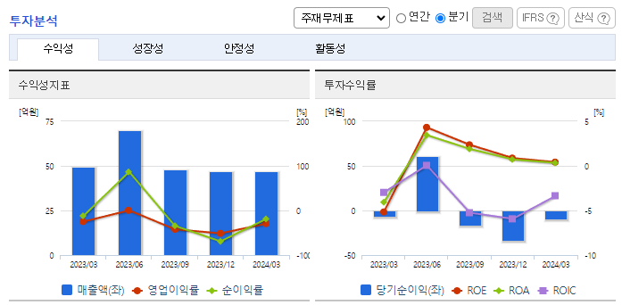 -2024년 3월 전년동기 대비 연결기준 매출액은 4.7% 감소, 영업손실은 13.1% 증가, 당기순손실은 51.4% 증가. 매출액의 감소는 전방위 산업의 투자지연과 중국시장 축소로 인해 발생하였으며, 영업 외 수익은 환율증가로 인한 보유환율의 환산이익 및 유형자산 매각으로 증가함. 대일 의존도가 높은 반도체 패키징 기판 검사기 초도 제품을 개발완료하여 시제품이 양산중이며 지속적인 개발로 반도체 기판검사 시장의 영역도 확보할 계획임.