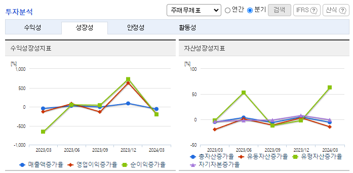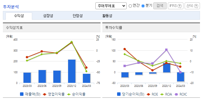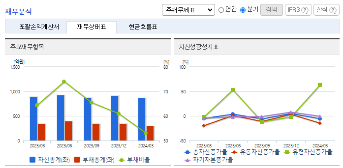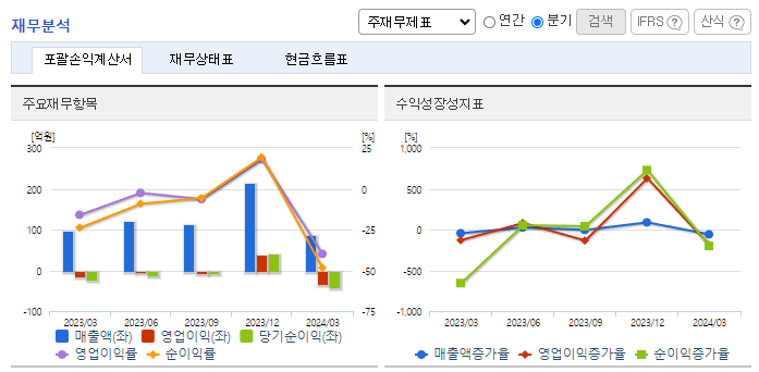 -2024년 3월 전년동기 대비 연결기준 매출액은 10.6% 감소, 영업손실은 123.5% 증가, 당기순손실은 69.1% 증가. 보안솔루션 사업 부문이 10.52% 증가했지만, 상품 사업 부문이 14.45% 감소하면서 전체 외형 성장에 악영향을 줌. 동사는 STO시장 선점을 위해 STO 전문성을 보유한 (주)펀블에 전략적 투자, 블록체인과 차세대 보안 솔루션을 결합한 STO 관련 신사업을 추진 계획임.