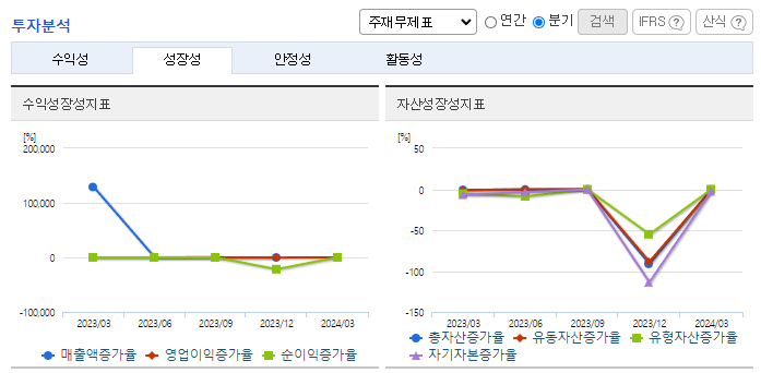 -2024년 3월 전년동기 대비 별도기준, 영업손실은 62.6% 감소, 당기순손실은 42.6% 감소. 2024년 5월 14일 분기보고서를 통해 분기 매출액 3억 원 미만으로 상장적격성 실질심사를 진행하여 상장폐지가 결정됨. 2023년 12월 서울회생법원에 회생절차개시를 신청하였으며, 2024년 1월 17일 동 법원으로부터 회생절차개시결정을 받아 보고기간 종료일 현재 회생절차를 진행 중