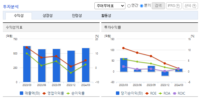 -2024년 3월 전년동기 대비 연결기준 매출액은 5.3% 감소, 영업이익은 65.9% 감소, 당기순이익은 82.7% 감소. 지난해 대비 가성소다 등의 판가가 하락함에 따라 매출 감소된 상황이며, 상대적인 원가율 상승 및 비용 증가 등으로 수익성은 다소 큰 폭으로 하락함. 반도체 및 디스플레이 시장이 지속 성장하고 있어 전망은 긍정적임. 활용 분야가 계속 확대될 것으로 예상돼 실적 개선 가능할 것으로 기대.