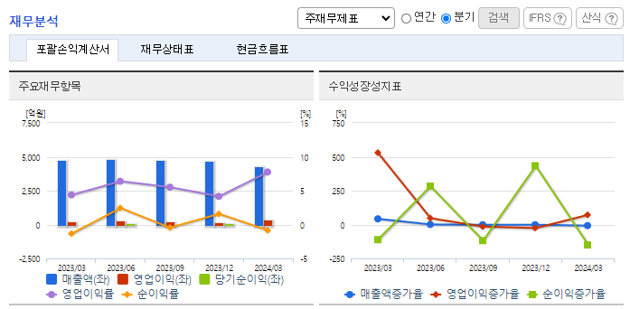 -2024년 3월 전년동기 대비 연결기준 매출액은 10.3% 감소, 영업이익은 59.1% 증가, 당기순손실은 43% 감소. 매출은 감소했지만 원재료인 옥수수, 소맥, 대두박, 비육돈, 우육의 가격이 큰 폭으로 하락해 영업이익에 긍정적인 영향을 줌. 양돈사업부문은 40여 년의 양돈사업을 통해 쌓아 온 노하우를 바탕으로 양돈사업 내에 있는 모든 이해관계자의 안정적인 수익성을 확보.