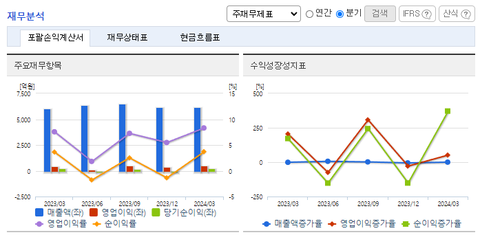 -2024년 3월 전년동기 대비 연결기준 매출액은 2.9% 증가, 영업이익은 13.2% 증가, 당기순이익은 4.6% 감소. 동사의 판관비 중 가장 높은 비중을 차지하는 광고선전비가 117억, 20.1% 감소함에 따라 영업이익 증가함. 국내 주류시장 외에도 일본을 비롯한 중국, 미국, 베트남 등 해외 주요 국가에 대한 마케팅 및 시장공략 강화를 통한 매출 확대 전략을 진행 중임.