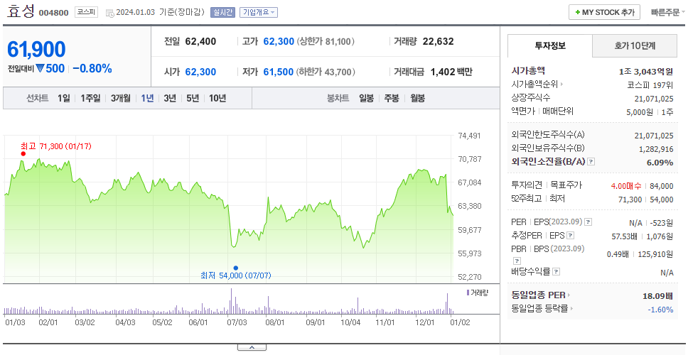 효성은 복합 산업 기업으로 장중 기준으로 주가는 62,400원입니다. 효성의 시가 총액은 1조 3043억 원이며 발행 주식수는 21,071,025주입니다. 외국인 보유 비중은 6.09%이며 장중 거래량은 22,632를 기록했습니다. 23년 3분기 매출액은 8,051억 원, 영업이익은 443억 원을 달성했으며, EPS는 1,037원입니다. 효성 주식 배당수익률은 없습니다.