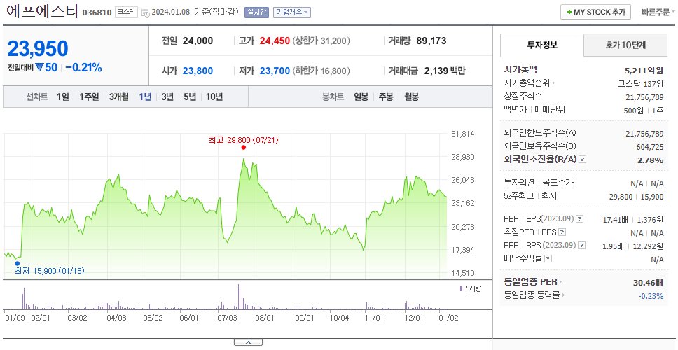 에프에스티는 반도체 및 관련장비 기업으로 장중 기준으로 주가는 24,000원입니다. 에프에스티의 시가 총액은 5211억 원이며 발행 주식수는 21,756,789주입니다. 외국인 보유 비중은 2.78%이며 장중 거래량은 89,173를 기록했습니다. 23년 3분기 매출액은 553억 원, 영업이익은 17억 원을 달성했으며, EPS는 36원입니다. 에프에스티 주식 배당수익률은 없습니다.