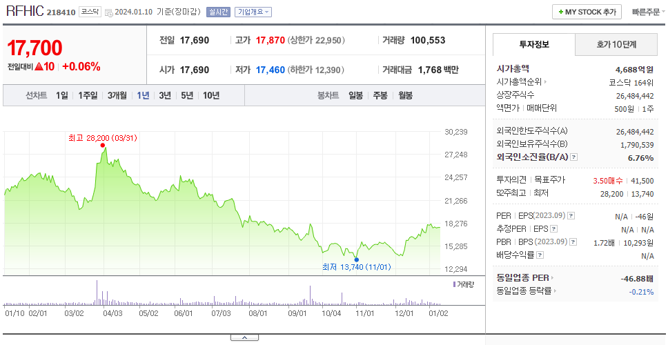RFHIC는 통신장비 기업으로 장중 기준으로 주가는 17,690원 입니다. RFHIC의 시가 총액은 4688억 원이며 발행 주식수는 26,484,442주입니다. 외국인 보유 비중은 6.76%이며 장중 거래량은 100,553를 기록했습니다. 23년 3분기 매출액은 200억 원, 영업이익은 -44억 원을 달성했으며, EPS는 -81원입니다. RFHIC 주식 배당수익률은 없습니다.
