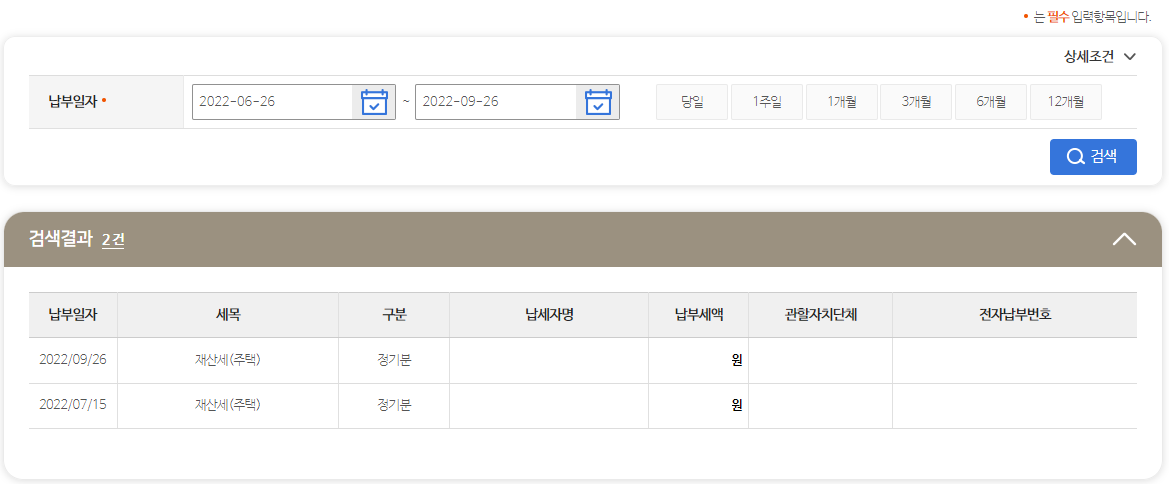 아래 그림은 3개월 기간을 검색한 결과이다. 7월에 22년도 1기분 납부하였고, 9월에 2기분 납부한 결과를 확인할 수 있다.