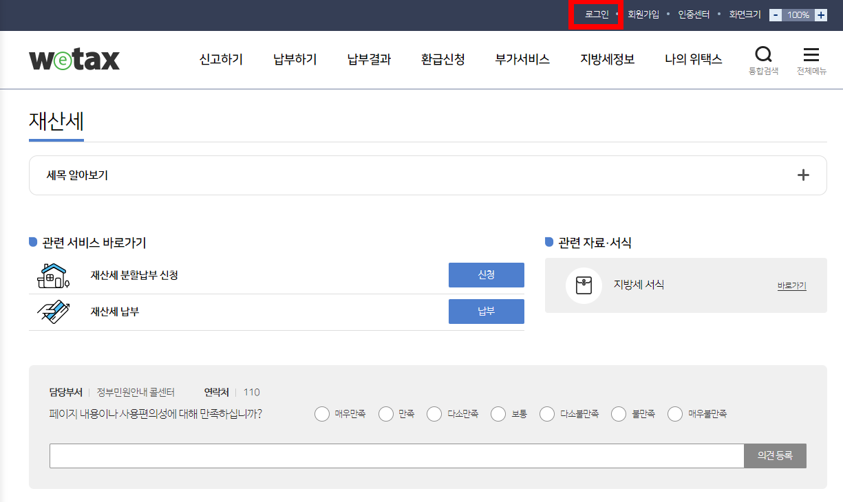 위택스에 접속을 하면 아래와 같은 페이지가 나옵니다. 빨간색 네모 로그인 클릭합니다.
