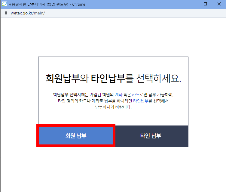 납부 버튼을 누르면 회원납부와 타인납부가 가능합니다. 여기서는 회원납부를 통해서 납부를 진행하겠습니다.