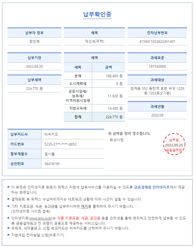 이후 신용카드를 사용하여 납부를 진행하면 아래와 같이 납부확인증이 나온다. 그러면 납부는 완료된 것이다.