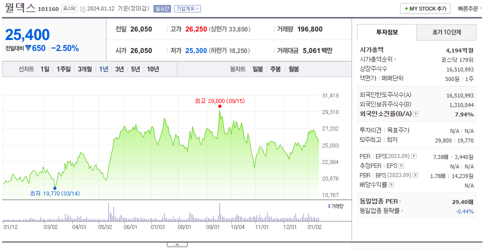 월덱스 현재 주가는 25,400원이며 전일 대비 -650(-2.50%) 원의 모습을 보이고 있습니다. 월덱스의 주주현황을 살펴보면 배종식(외 2인)이 지분 35.07%를 소유하고 있습니다. 월덱스는 반도체 및 관련장비 기업으로 장중 기준으로 주가는 25,400원입니다. 월덱스의 시가 총액은 4194억 원이며 발행 주식수는 16,510,993주입니다. 외국인 보유 비중은 7.94%이며 장중 거래량은 196,800를 기록했습니다. 23년 3분기 매출액은 681억 원, 영업이익은 175억 원을 달성했으며, EPS는 954원입니다. 월덱스 주식 배당수익률은 없습니다.