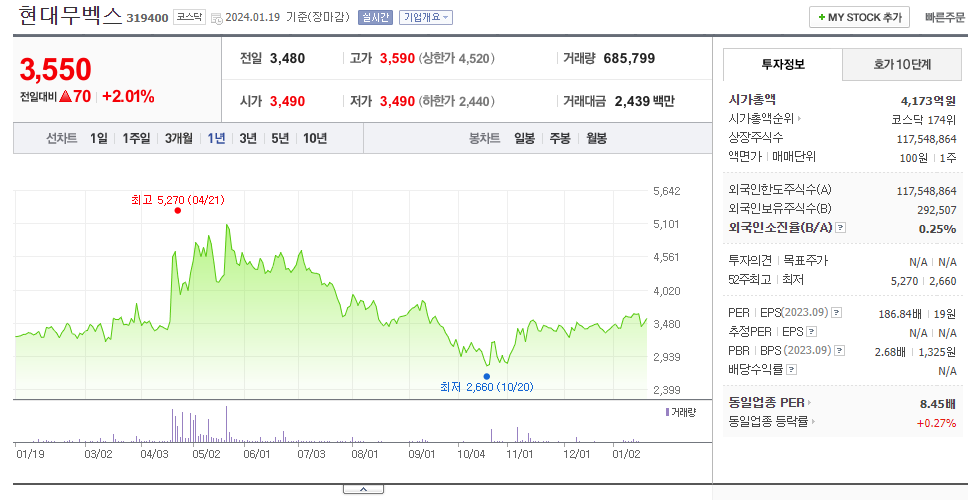 현대무벡스는 운송인프라 기업으로 장중 기준으로 주가는 3,480원입니다. 현대무벡스의 시가 총액은 4173억 원이며 발행 주식수는 117,548,864주입니다. 외국인 보유 비중은 0.25%이며 장중 거래량은 685,799를 기록했습니다. 23년 3분기 매출액은 771억 원, 영업이익은 52억 원을 달성했으며, EPS는 38원입니다. 현대무벡스 주식 배당수익률은 없습니다.