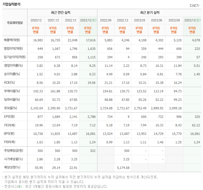 -2023년 9월 전년동기 대비 연결기준 매출액은 24% 감소, 영업이익은 17.2% 감소, 당기순이익은 9.2% 증가. 전방 수요 부진에 따라 지난해 4분기 이후 매출은 지속적으로 감소했지만, 시장 예상과 비슷한 수준이었고, 그동안의 비용 부담 축소 노력 덕분에 수익성이 상당히 개선되었음. 수주는 완만하게 회복 중에 있으며 수익성은 개선되고 있어 연간 가이던스인 매출액 1.76조 원/영업이익 1,600억 원은 달성할 것으로 전망.