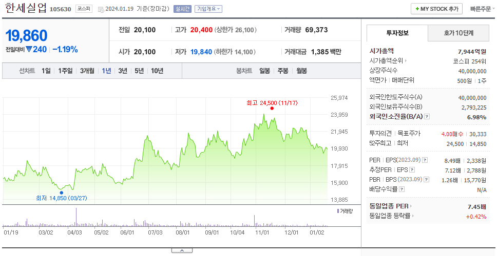 한세실업은 섬유 및 의복 기업으로 장중 기준으로 주가는 19,860원입니다. 한세실업의 시가 총액은 7944억 원이며 발행 주식수는 40,000,000주입니다. 외국인 보유 비중은 6.98%이며 장중 거래량은 69,373를 기록했습니다. 23년 3분기 매출액은 5,120억 원, 영업이익은 606억 원을 달성했으며, EPS는 996원입니다. 한세실업 주식 배당수익률은 없습니다.