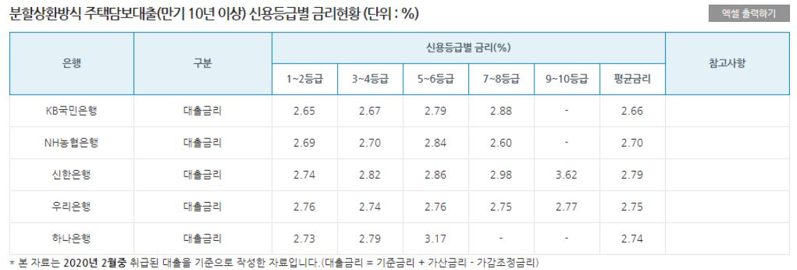 은행별로 가산금리는 다르기 때문에, 대출을 받을 때에는 많은 은행을 비교 검토하여 조건에 맞는 낮은 금리를 찾아야 할 것이다. 아래 20년도 자료를 보면 은행별로 금리가 다른 것을 알 수 있으며, 같은 은행이라도 신용등급에 따라서 이자가 낮아진다. 신용등급이 낮아질수록(1등급이 가장 높은 등급이다.) 즉 10등급으로 가까이 갈 수록 금리는 높아진다.