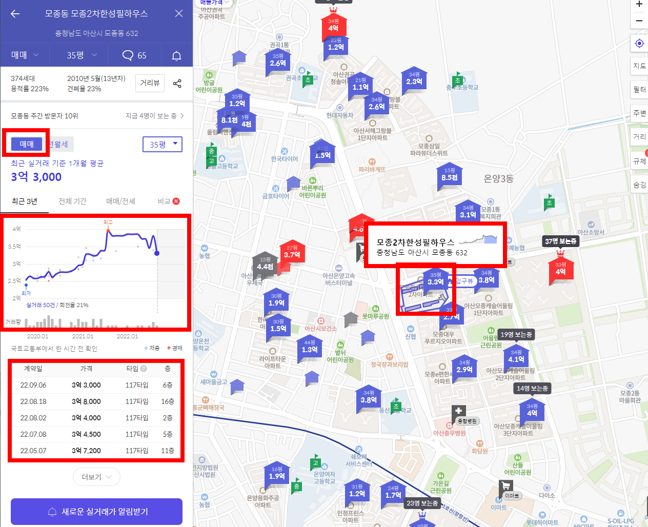 - 왼쪽 화면에서 3억 3000만원 임을 확인할 수 있다. 이는 최근 실거래 기준 1개월 평균가격이다.